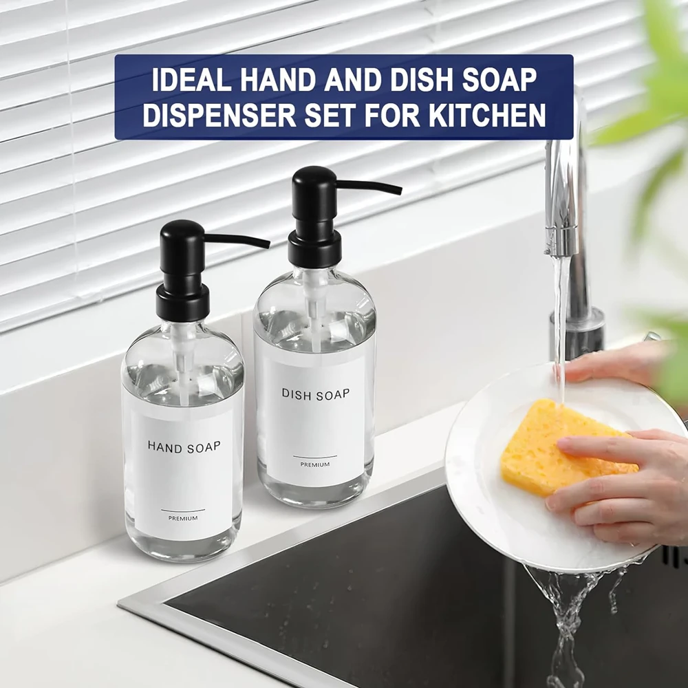 Clear Glass Soap Dispenser, Bathroom Kitchen Hand Dish Soap Dispenser Set with Matt Black Stainless Steel Pump, 2pcs 16Oz 500ml